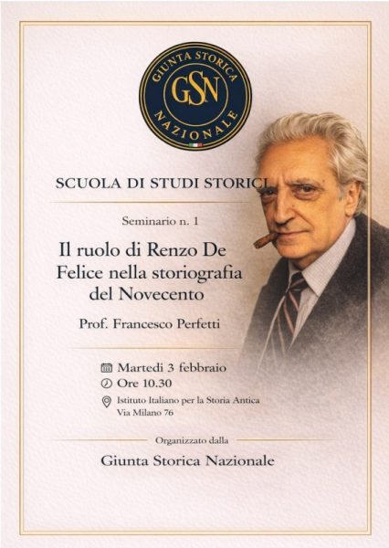 Con il seminario del prof. Francesco Perfetti, dedicato al ruolo di Renzo De Felice nella storiografia del Novecento, prende avvio la Scuola di studi storici della Giunta Storica Nazionale, il cui scopo è offrire un percorso formativo ai borsisti post-doc della Giunta e degli Istituti storici nazionali.